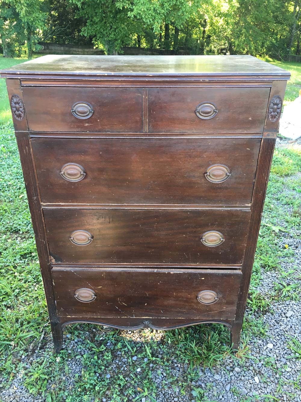 This old dresser has seen some things. While the structure was intact and there were some lovely details giving the piece character and charm, the stain was faded, the finish chipped and the wood in dire need of some TLC. To give the piece new life, we decided to clean it up with a few coats of Parchment — and we really did need a few coats.